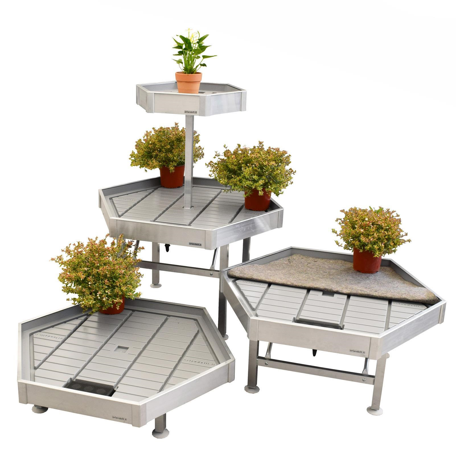 Die sechseckige Tische wurden mit drei verschiedenen Höhen (350-550-750 mm) und einem Doppeltisch erstellt, so kann man Ausstellungsspiele auch in der Höhe schaffen, aber vor allem für eine richtige Ausstellung aller Pflanzensorten von der niedrigsten bis der höchsten.