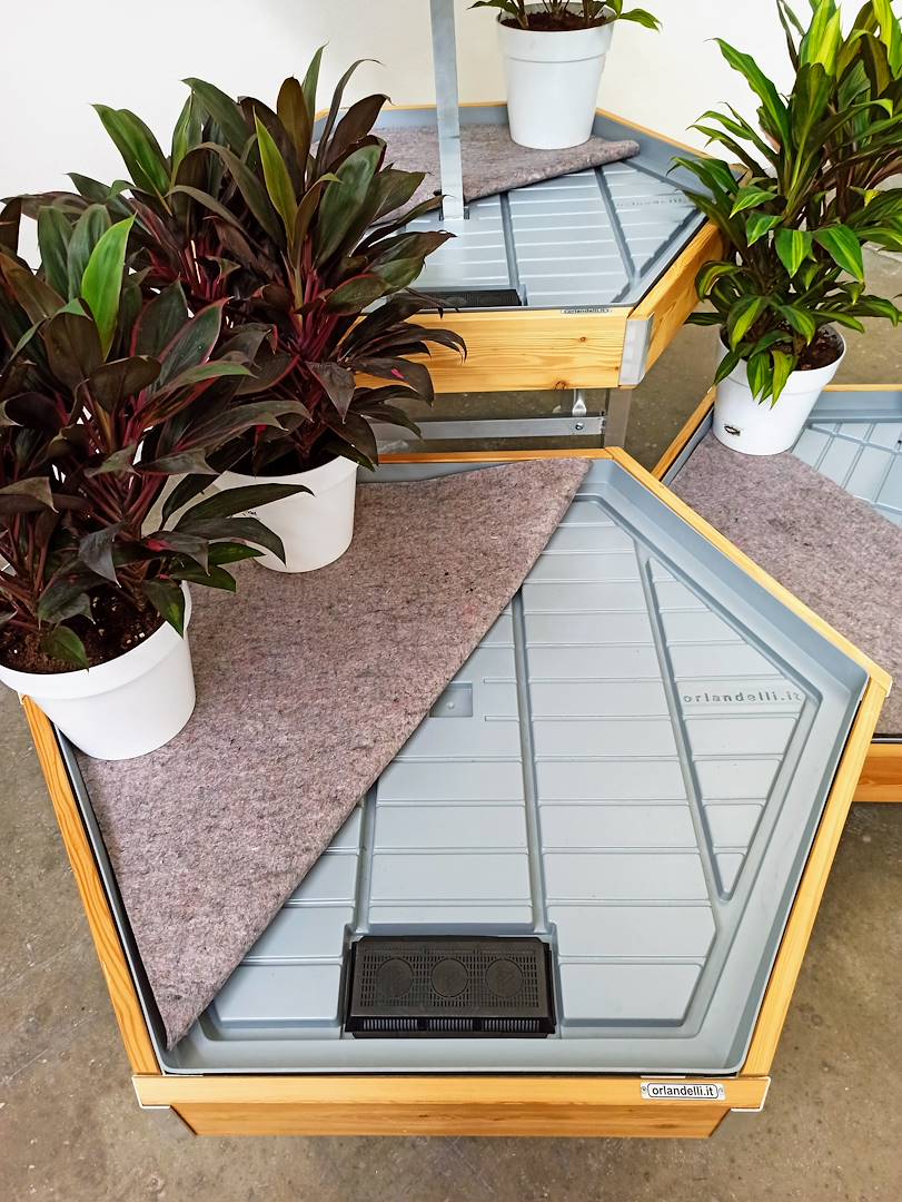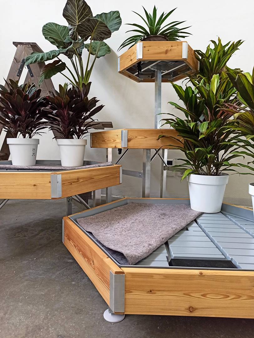 Die sechseckige Tische wurde mit drei verschiedenen Höhen (350-550-750 mm) und einem Doppeltisch gesehen, so dass man Ausstellungsspiele auch in der Höhe schaffen kann, aber vor allem für eine bestimmte Ausstellung aller Pflanzensorten von der nieder.