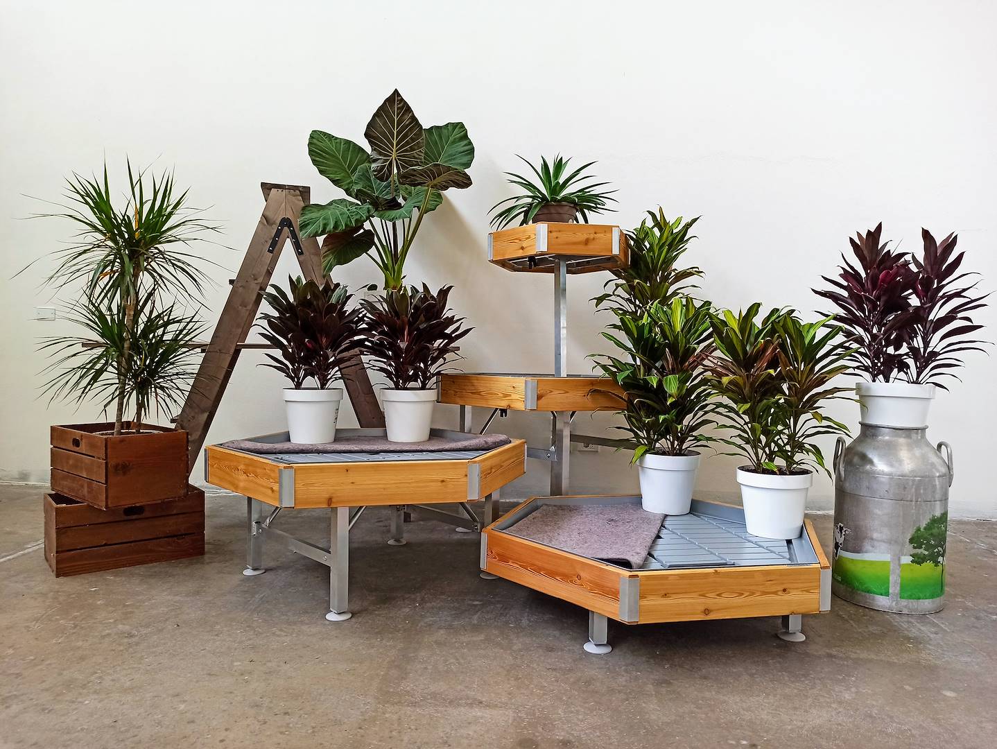 Das sechseckige Set eignet sich zur Darstellung verschiedener Pflanzentypen. Die Positionierung am Eingang eines Geschäfts mit beispielsweise drei verschiedenen Pflanzentypen oder derselben Pflanze in drei verschiedenen Farben an jedem Sechseck erzeugt einen schönen chromatischen Effekt.