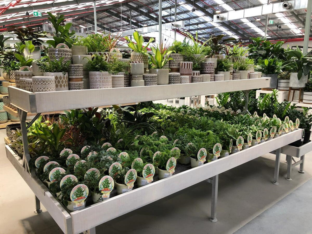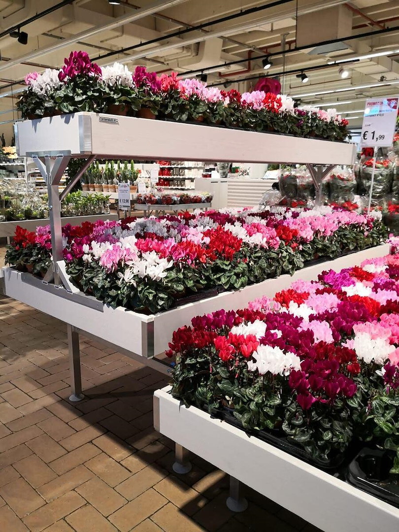 Die erhöhten Palettenprofile bestehen aus gebleichtem Holz und können nach Kundenwunsch angepasst werden. Dies macht sie zu einer der dynamischsten Einrichtungslösungen für Gartencenter auf dem Markt.