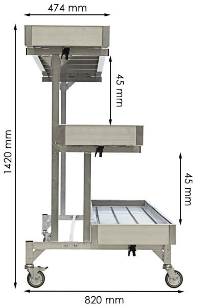 Mehrstöckiger Verkaufsstand aus der Palette der Verkaufstische, mit Polystyrolwasserwanne, Typ Dänenkarren, mit dichtem Boden, Struktur aus Alu-Legierung, Ablasshahn, 2 Lenkrollen und 2 Räder mit Bremse ø 100 mm.