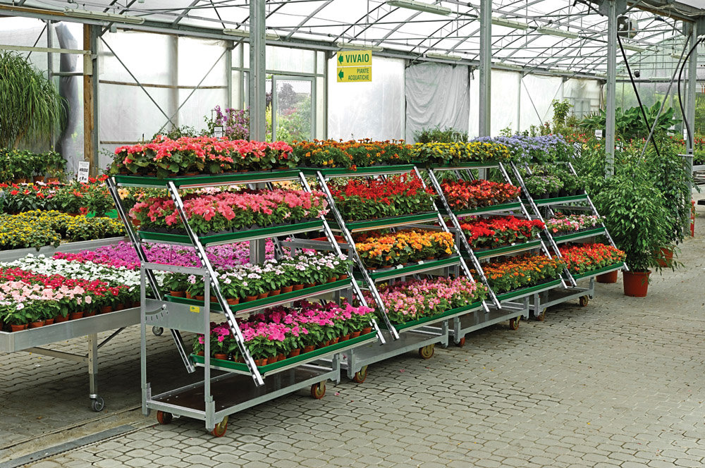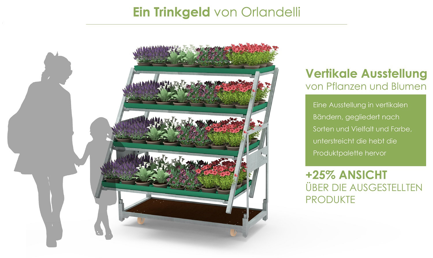 GROSSHANDEL: der zu vielen Gelegenheiten verwendete Cabriolet-Verkaufsständer auch für Kampagnen zur Verkaufsförderung ideal geeignet. Durch seine Benutzung werden Arbeiten,  vom Abladebereich bis zum Ausstellen der Produkte,  mit geringem Zeitaufwand und reduzierter Arbeitskraft ausgeführt. Das Verhältnis  der pro Quadratmeter augestellten Pflanzen wird durch die vertikale Ausstellung maximal ausgenutzt.  Durch das Einsetzen der Unistandard-Wasserbehälter bleibt die Verkaufsstelle immer sauber und ordentlich.