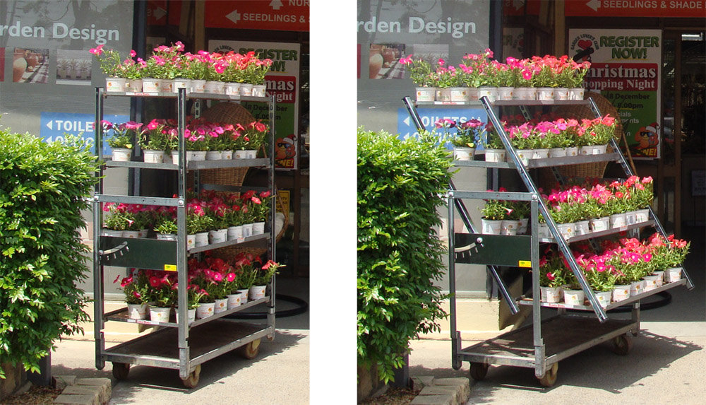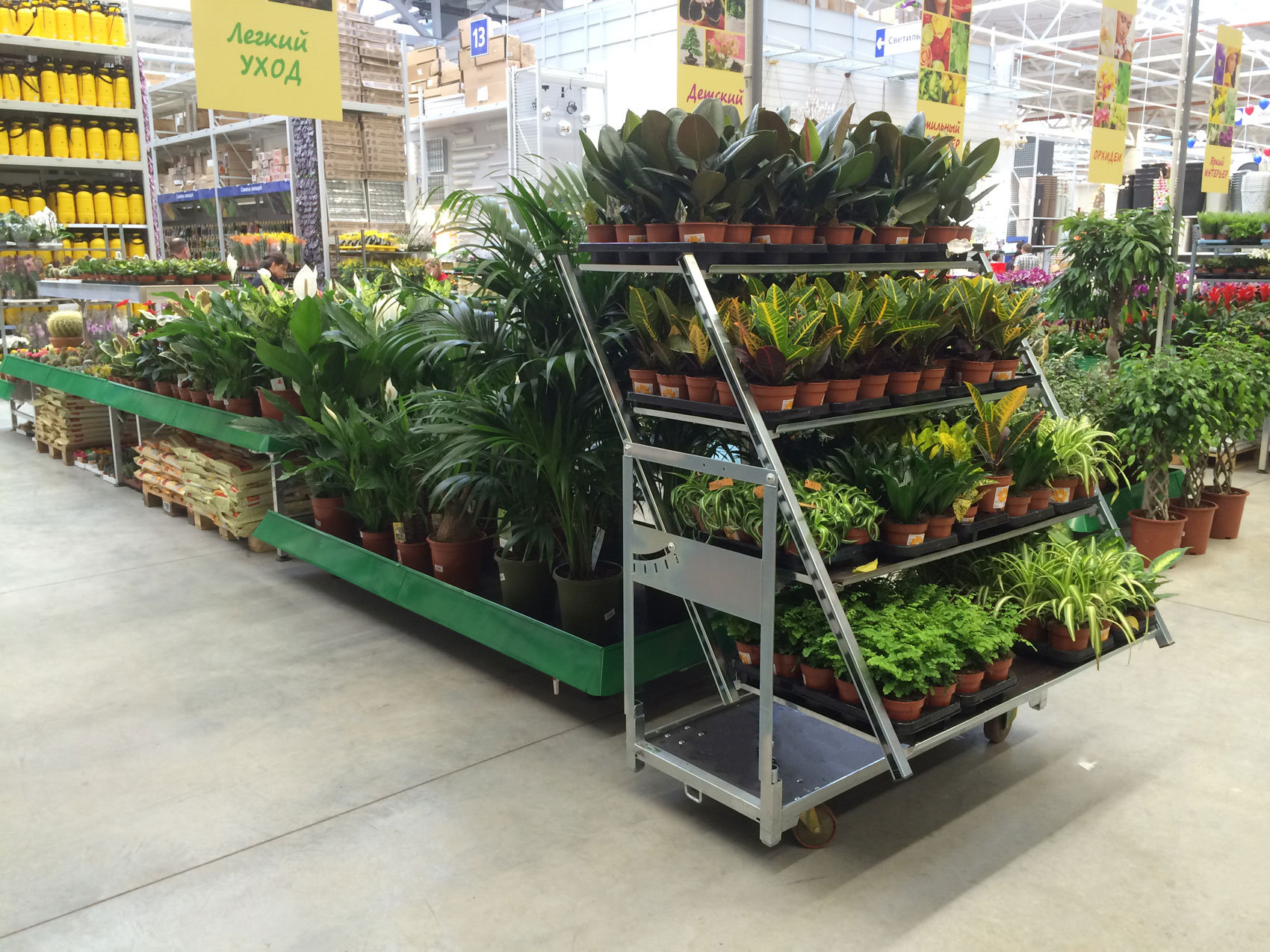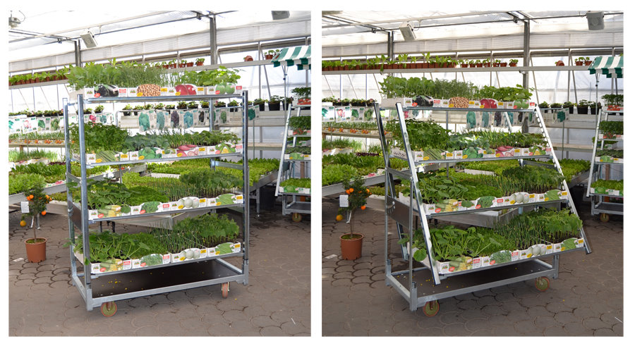 GARTENCENTER UND BLUMENLÄDEN: für Verkaufsstellen oder Gartencenter, die ihre Produkte im Außenbereich ausstellen und diese daher täglich rein und raus befördern müssen, ist  der Cabriolet Verkaufsständer die geeignete Lösung. Durch den Klappmechanismus kann der Verkaufsständer in wenigen Sekunden geöffnet und geschlossen werden und deshalb in kürzester Zeit in den Außen- oder Innenbereich gebracht werden kann.