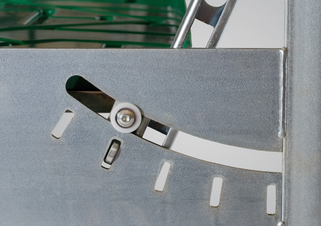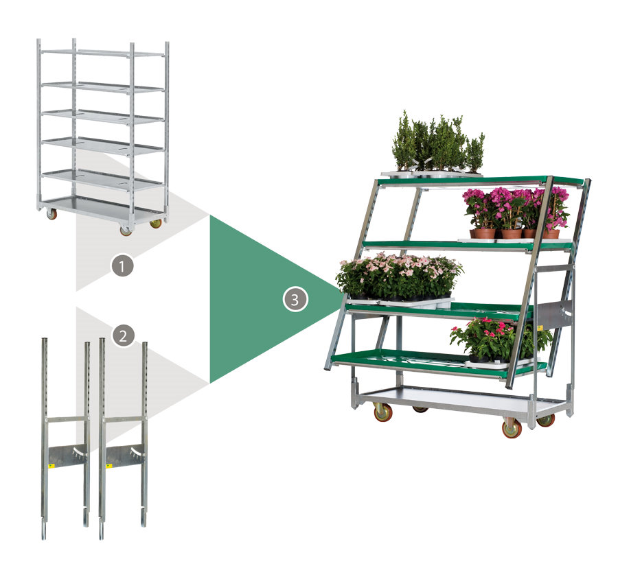 Je nach Höhe der Pflanzen können die Böden durch eine knopflochartige Struktur  verstellt werden, wie es bereits bei den Dänenkarren der Fall ist. Die mitgelieferten Wasserwannen erhalten die Pflanzen gesund und der Ausstellungsraum bleibt sauber, weil das Wasser und die Erde nicht vom Regal auf die darunter stehenden Pflanzen und auf den Fußboden gelangen. Das Schnappsystem zum Öffnen und Schließen gewährleistet ein schnelles Aufstellen und erleichtert das Verstellen vom Außen- in den  Innenbereich und umgekehrt.