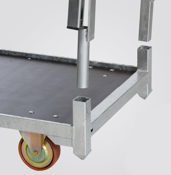 3) Robuste Rollen, die das Hantieren wie  mit einem normalen Dänenkarren möglich machen ohne dabei  Beschädigungen zu fürchten.