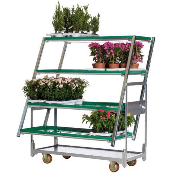 Der  Cabriolet-Verkaufskarren zum Ausstellen von Pflanzen und Blumen hat als Basis den Unistandard-Dänenkarren, die ideale Ausstattung für Gärtnereien, Gewächshäuser, Gartencenter und Blumenläden.