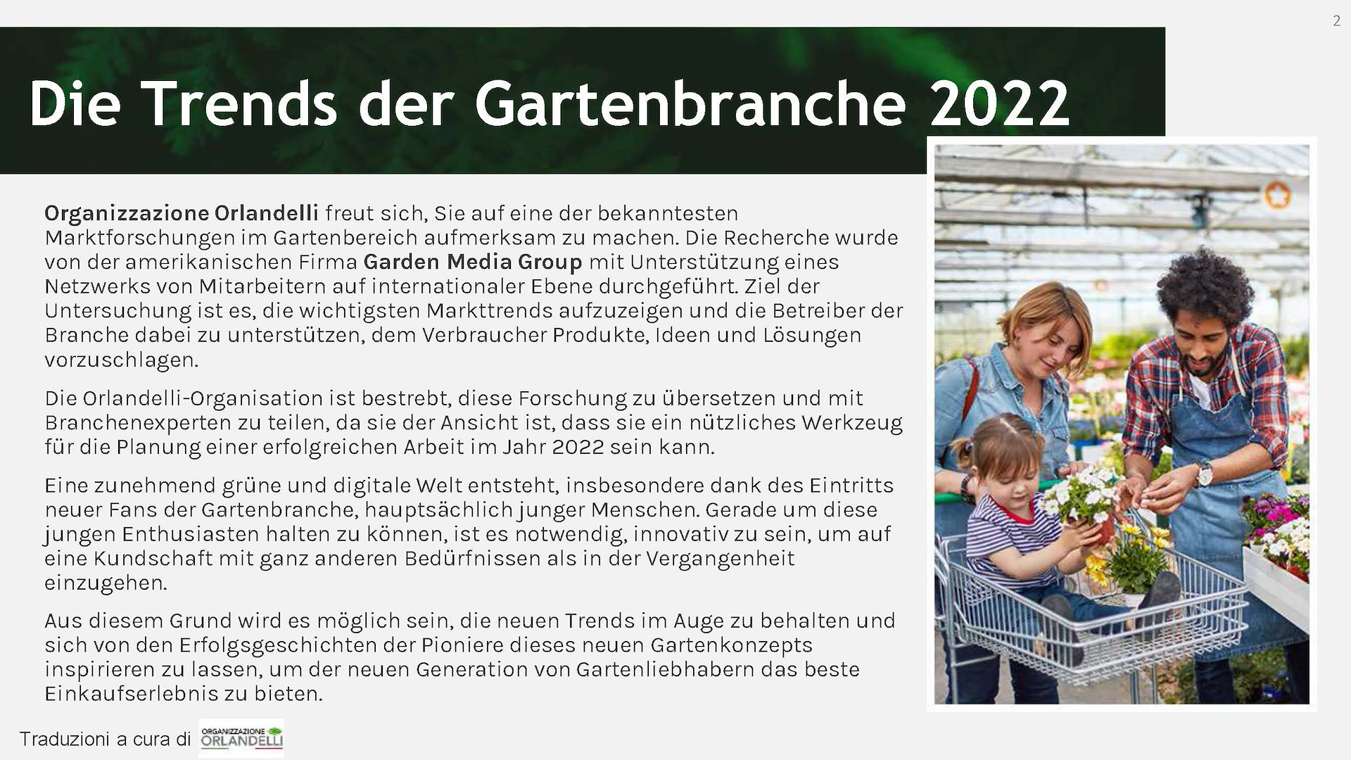 Organizzazione Orlandelli freut sich, eine der bekanntesten Forschungsergebnisse im Gartensektor an Spezialisten der Branche weiterzugeben, da sie der Ansicht ist, dass sie ein nützliches Werkzeug für die Planung einer erfolgreichen Arbeit im Jahr 2022 sein kann.