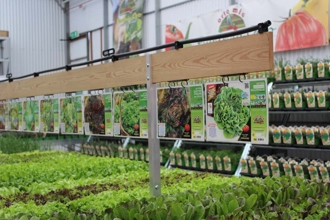 Das Bewässerungssystem Die Bewässerung von Pflanzen und Blumen in den Verkaufsstellen muss korrekt verwaltet werden. Dazu erfüllen die von uns angebotenen Anzeigesysteme diesen Bedarf vollständig (Handbuch zur Bewässerung in den Verkaufsstellen, hier klicken). Insbesondere gibt es Pflanzen, die eine Unterbewässerung bevorzugen, wie Blütenpflanzen und Grünpflanzen, während andere, wie Gemüse- und Aromapflanzen oder Baumschulpflanzen, die Bewässerung bevorzugen Regen. Der neue Kartenhalter aus Holz ist für das Bewässerungssystem konzipiert, das speziell für Umgebungen entwickelt wurde, in denen Pflanzen und Blumen verkauft werden. Das Sprinkler-Bewässerungssystem ist auf dem Holzstreifen angeordnet, und der Aktionsradius wird durch ein Ventil reguliert, das auf der Grundlage des Wasserdrucks die Pflanzen auf der Ausstellungsbank benetzt und die Überflutung der Korridore begrenzt. Die Bewässerung in Geschäften wird verwendet, um die Pflanzen in einem optimalen Verkaufszustand zu halten. Aus diesem Grund muss die Benetzung auch präzise sein, um die Pflanzen und die Umwelt sauber zu halten. Design, Modernität und effektive Nutzung kennzeichnen unsere Anzeigesysteme für Pflanzen und Blumen wie den neuen Holzkartenhalter.