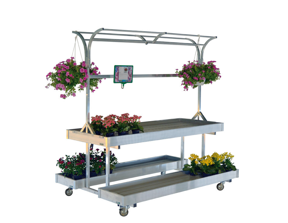 Gebogener Alu-Tischampelaufsatz für Alu-Verkaufstische, mit Anti-Überschlagsystem. Höhenverstellbar in drei Stufen (1360/1760 mm in Bezug auf die Ebene des Tisches).