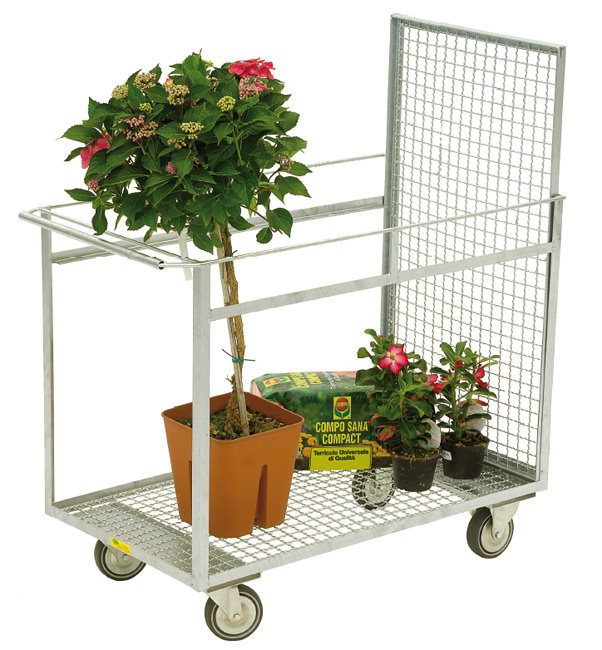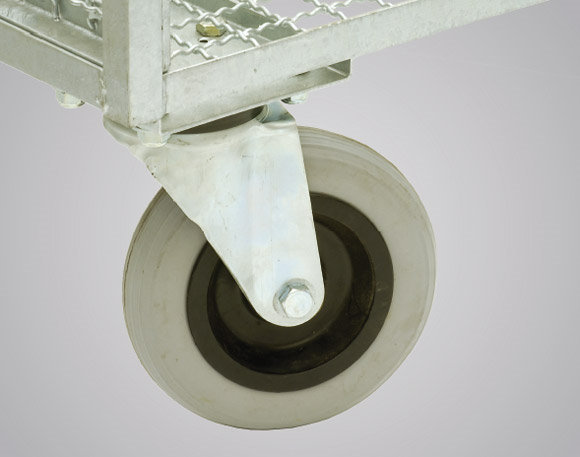 Gummiräder Ø 200 mm, feuerverzinkt. 2 Böden. Der obere Boden ist herausnehmbar.