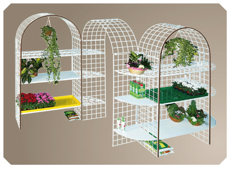 Diese Verkaufsregale sind dafür konzipiert, die Exposition von Pflanzen und Blumen und Gärtnereizubehör noch wirkungsvoller zu gestalten, um damit den Verkauf zu unterstützen.