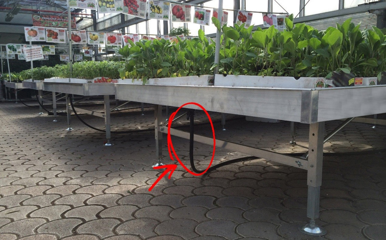 Die halbautomatische oder manuelle Bewässerung ist die beste Lösung für die Gartencentern jeder Größe. Im Fall von hybride Bereichen, beispielsweise in Gegenwart von Saisonpflanzen, kann man das automatisches System einstellen, um die Wanne auf ein Minimum zu füllen, so dass das Wasser dem Punkt der Unterstützung zwischen dem Topf und der Wanne berührt. Es ist wichtig, die Stagnation des Wassers, die nach einer oder zwei Stunden entwässert werden sein muss, je nach der Art und der Größe der Pflanze, zu vermeiden. Die Entwässerung kann auch für normale Absorption auftreten. Die Technik der manueller Bewässerung mit dem Gummischlauch ist noch einfacher und funktionsfähiger für die spezifische Eigenschaften des Tisches, der mit Drainagekanälen, Filtern, Ventile usw. ausgerüstet ist. Der Mix der Automatisierung ermöglicht den Betreibern, hervorragende Ergebnisse, die, obwohl es "teuer" aussieht, viele Vorteile auf lange Sicht bringen werden, zu erreichen. Der wichtigste Faktor ist die Erfahrung des Bedieners, der, zusätzlich zum Überwachen des Zustands des Wassers den Gesundheitszustand von Pflanzen bestimmen könnte. Um Ordnung und Sauberkeit im Gartencenter zu bewahren, sollte man immer für eine Form der Untergrundbewässerung optieren, behaltend so die Pflanzen immer sauber und trocken in Oberfläche. Die Tische müssen immer 100% abgeflacht sein werden. Das ist eine einfache Aufgabe dank den verstellbaren Füßen und Beinen. Wenn die Tische länger als 3 Meter sind, ist es notwendig, die Ventile an beiden Enden, um eine homogenere Bewässerung zu erhalten, anzuwenden.