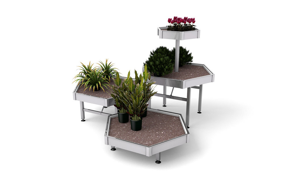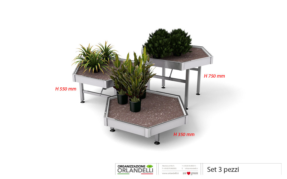 Die sechseckige Tische wurden mit drei verschiedenen Höhen (350-550-750 mm) und einem Doppeltisch erstellt, so kann man Ausstellungsspiele auch in der Höhe schaffen, aber vor allem für eine richtige Ausstellung aller Pflanzensorten von der niedrigsten bis der höchsten.
