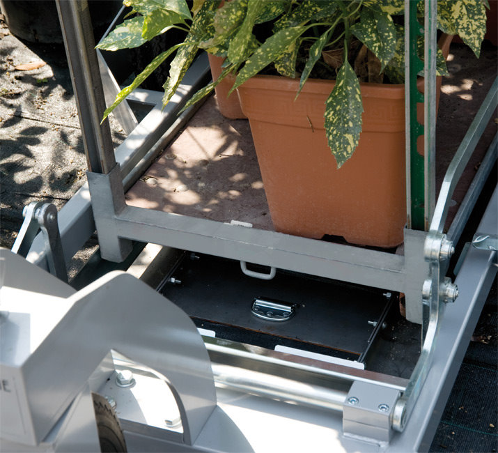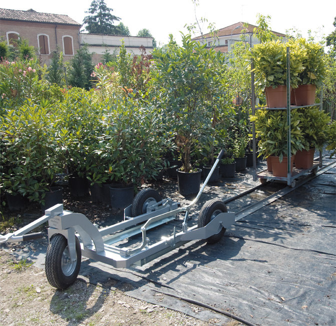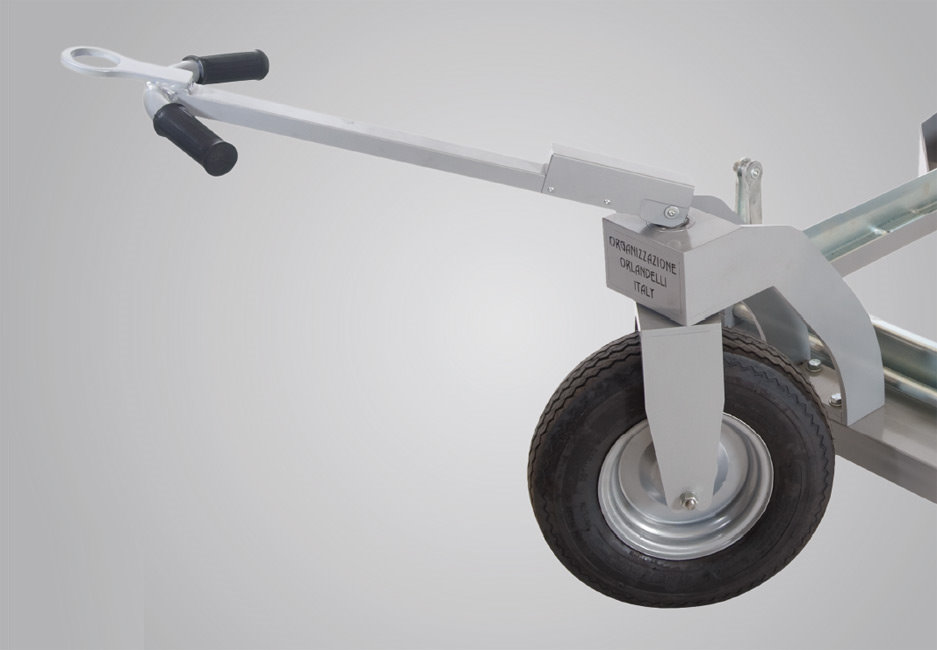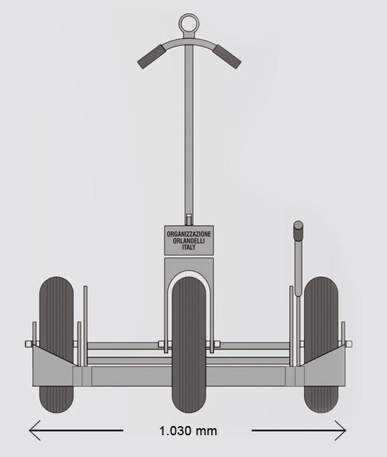 Wenn das Manövrieren des Unistandard-Wagens auf Kies, Sand oder unbefestigten Flächen schwierig wird, ist die ideale Lösung der Wagenhalter für Unistandard-Wagen von Organizzazione Orlandelli. Dank eines bewährten und äußerst effektiven Designs ermöglicht dieses Werkzeug den sicheren und einfachen Transport von beladenen Dänenkarren, selbst auf unebenen Böden.