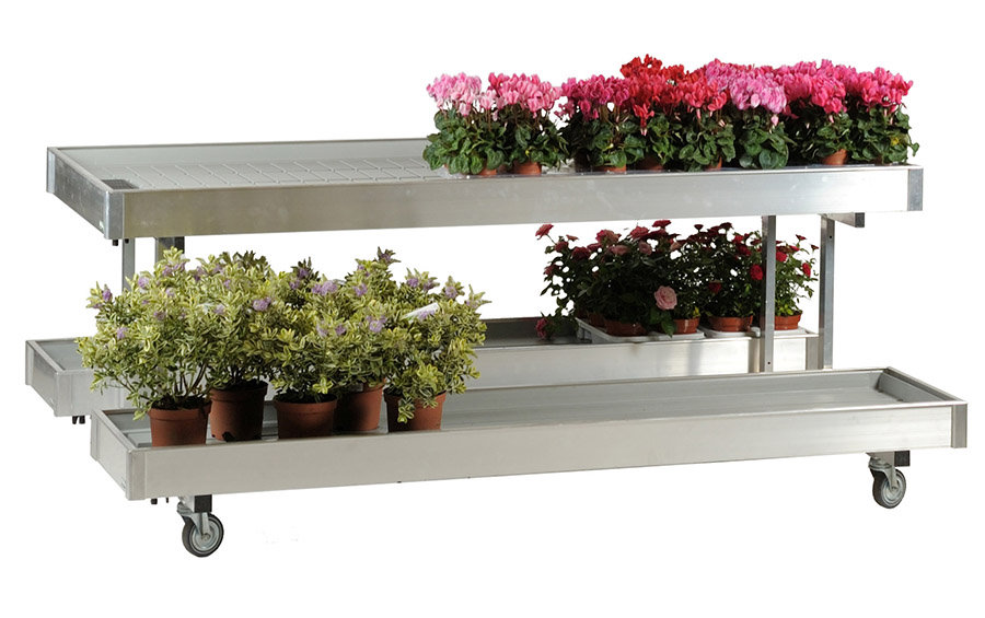 Etagen-Verkaufsständer von der selber Produktpalette der Verkaufstische, mit Einlegeböden aus Polystyrol, Aluminiumstruktur, Ablasshahn, 2 Lenkrollen und 2 Lenkrollen mit Bremse Ø100 mm.