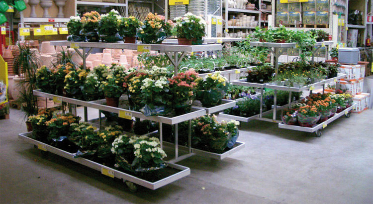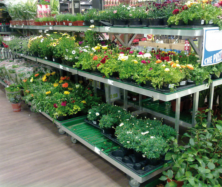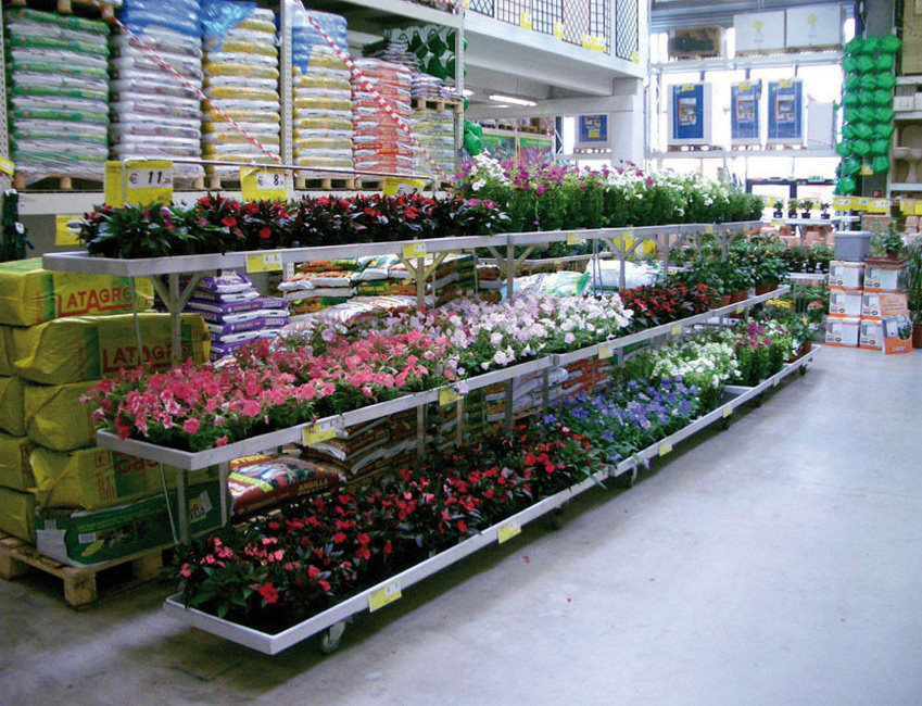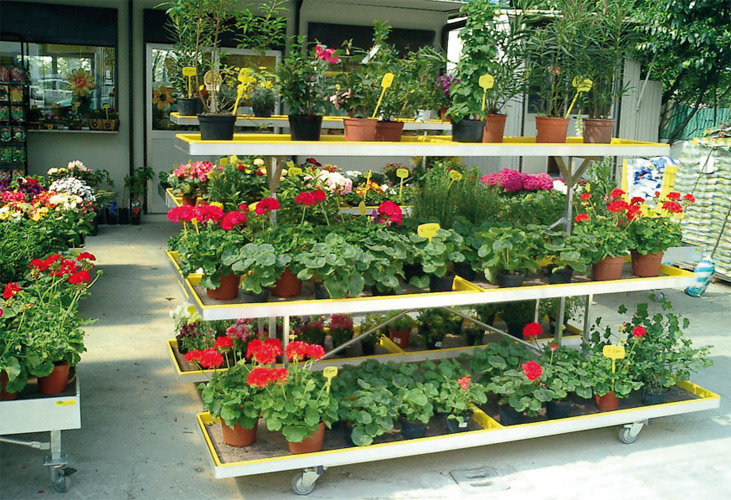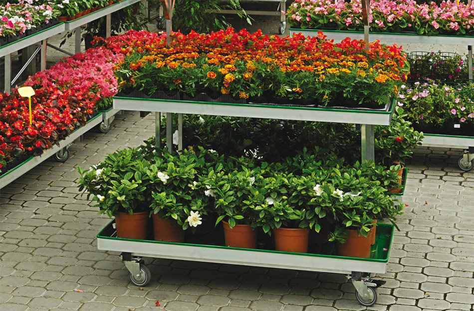 Der Aussteller für Blumen und Pflanzen verfügt über Rollen für eine leichte Beweglichkeit auch bei voller Ladung, und ermöglicht dadurch die Anordnung der Einrichtung innerhalb der Gärtnerei oder des Gewächshauses je nach Bedarf.