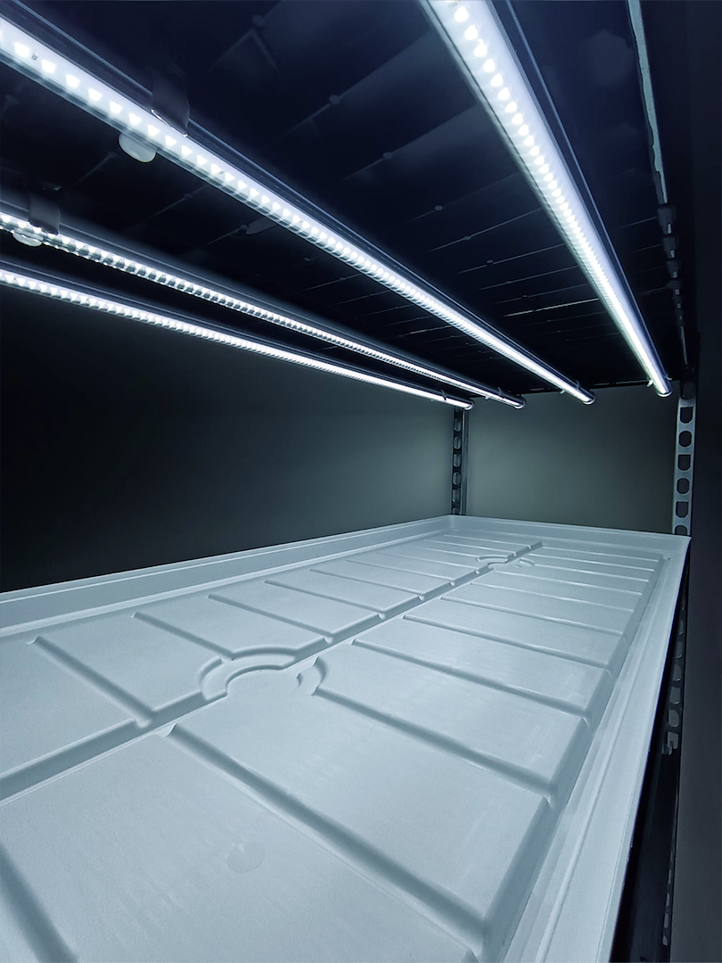 • Gestión de la Luz: Cada nivel está equipado con iluminación fija que garantiza una distribución uniforme de fotones sobre cada planta, evitando zonas de sombra.
