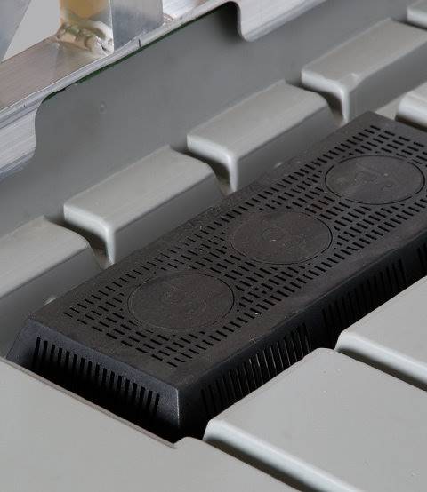 El estante de poliestireno que forma la mesa, tiene alta resistencia a los rayos UV y antireflejos con una altura de 65 mm y se completa con filtro y grifo de descarga. Las grietas que lo caracterizan evitan el estancamiento del agua y le permiten una buena adaptación para la irrigación con instalación flujo y reflujo. Los travesaños de soporte de la pileta están dispuestos de tal manera para garantizar un porte de carga hasta los 70 kg/mq.